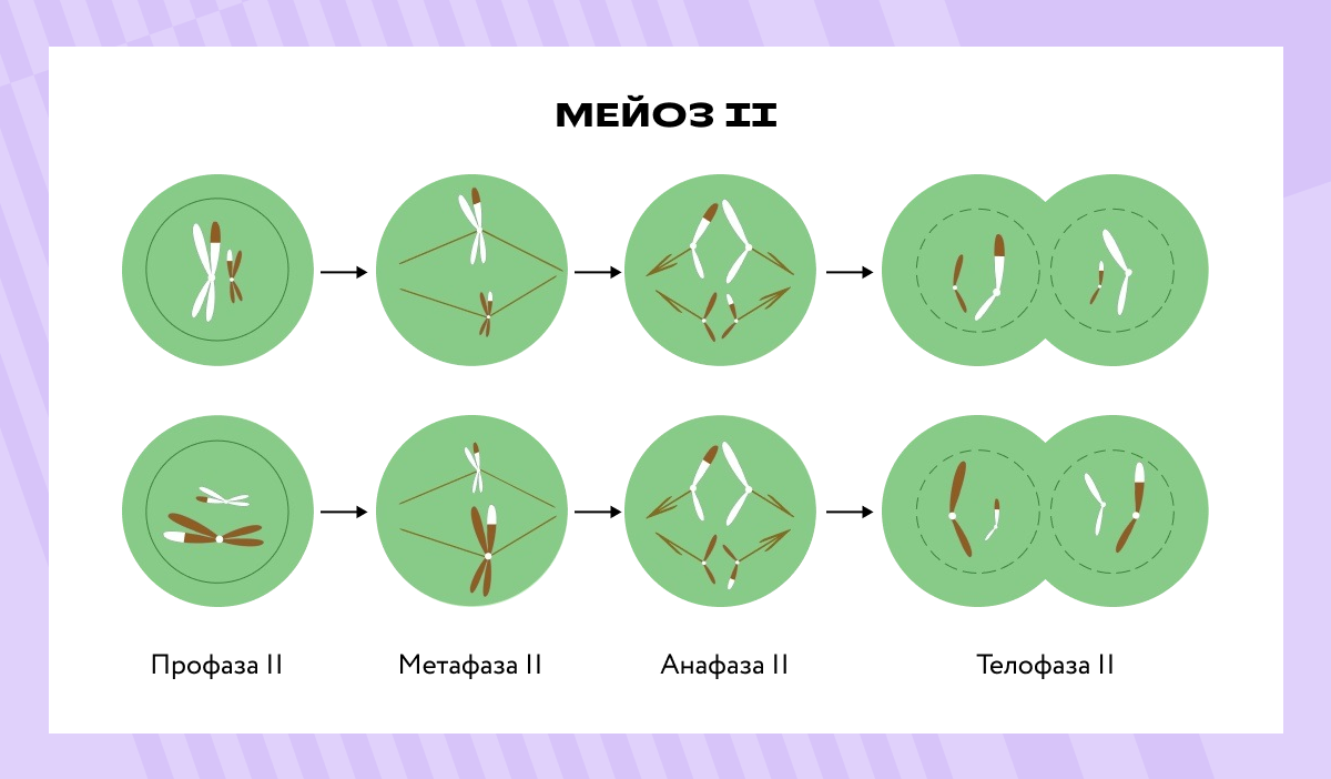 Второе деление мейоза представляет собой типичный митоз, в ходе которого к полюсам клетки расходятся хроматиды. В результате второго деления образуются четыре клетки с одинарным (n) набором хромосом. После второго деления мейоза следует непосредственное формирование половых клеток (гамет).