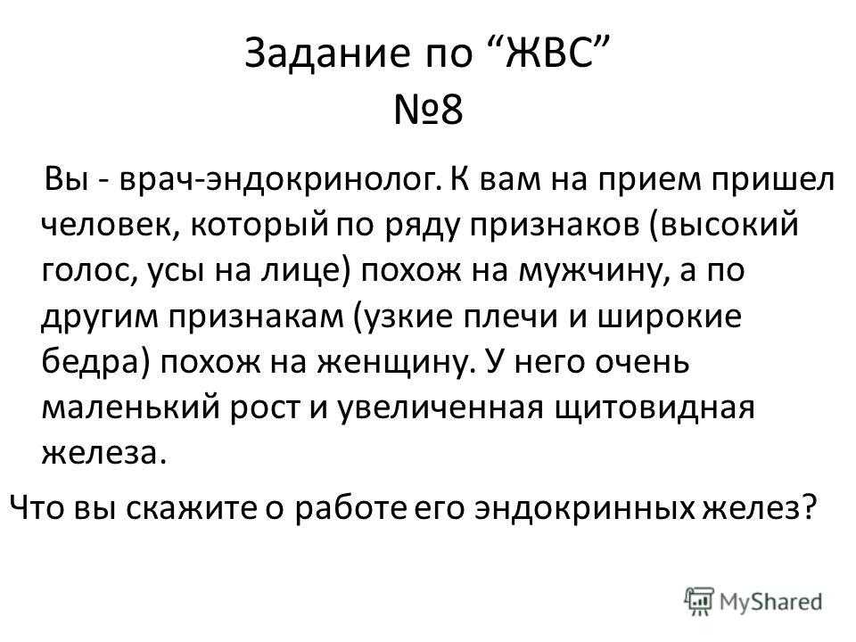 Задание по ЖВС 8 Вы — врач-эндокринолог. К вам на прием пришел человек, который по ряду признаков (высокий голос, усы на лице) похож на мужчину, а по другим признакам (узкие плечи и широкие бедра) похож на женщину. У него очень маленький рост и увеличенная щитовидная железа. Что вы скажите о работе его эндокринных желез?