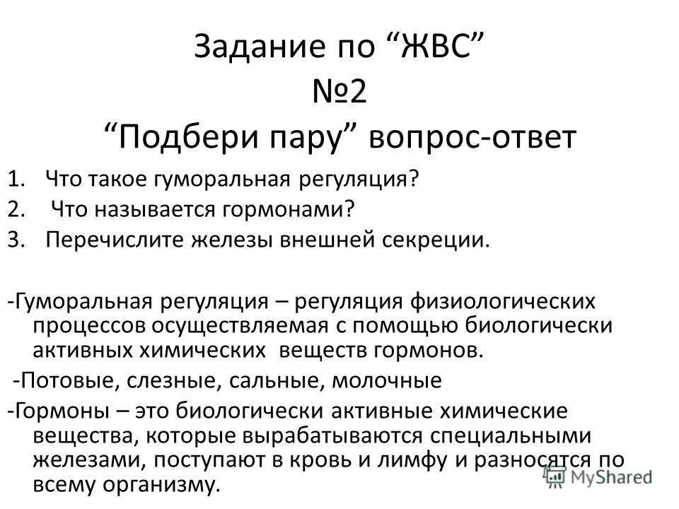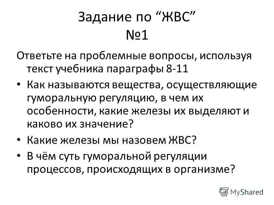 Задание по ЖВС 1 Ответьте на проблемные вопросы, используя текст учебника параграфы 8-11 Как называются вещества, осуществляющие гуморальную регуляцию, в чем их особенности, какие железы их выделяют и каково их значение? Какие железы мы назовем ЖВС? В чём суть гуморальной регуляции процессов, происходящих в организме?
