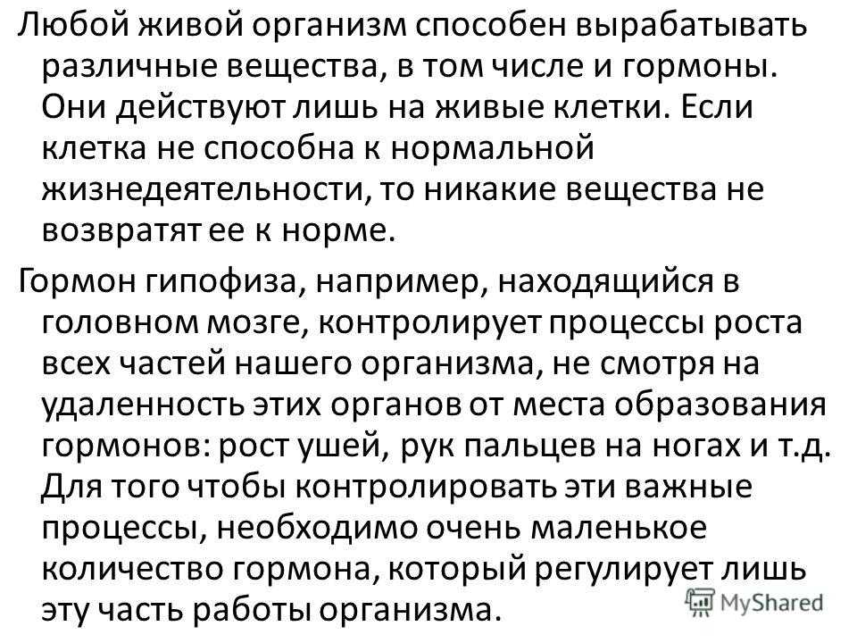 Любой живой организм способен вырабатывать различные вещества, в том числе и гормоны. Они действуют лишь на живые клетки. Если клетка не способна к нормальной жизнедеятельности, то никакие вещества не возвратят ее к норме. Гормон гипофиза, например, находящийся в головном мозге, контролирует процессы роста всех частей нашего организма, не смотря на удаленность этих органов от места образования гормонов: рост ушей, рук пальцев на ногах и т.д. Для того чтобы контролировать эти важные процессы, необходимо очень маленькое количество гормона, который регулирует лишь эту часть работы организма.