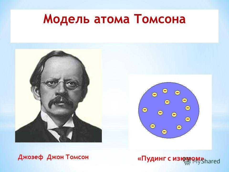 В 1904 году Дж. Дж. Томсон предложил свою модель атома. Основные положения теории сводились к тому, что атом представлялся положительно заряженным телом, внутри которого находились электроны с отрицательным зарядом. Позже эта теория была опровергнута Э. Резерфордом.