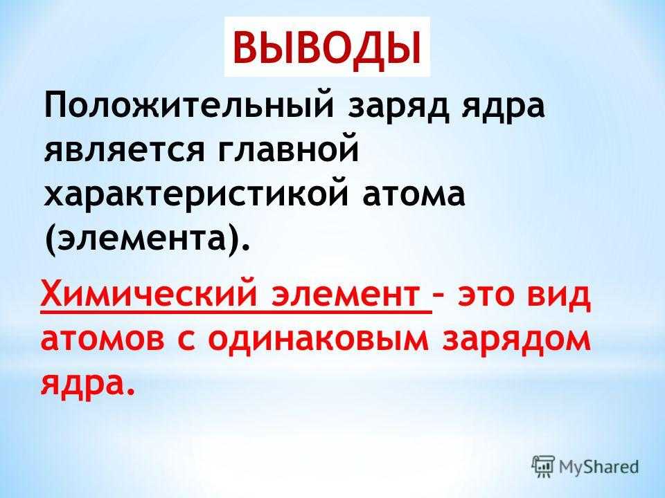 Положительный заряд ядра является главной характеристикой атома (элемента). Химический элемент – это вид атомов с одинаковым зарядом ядра. ВЫВОДЫ