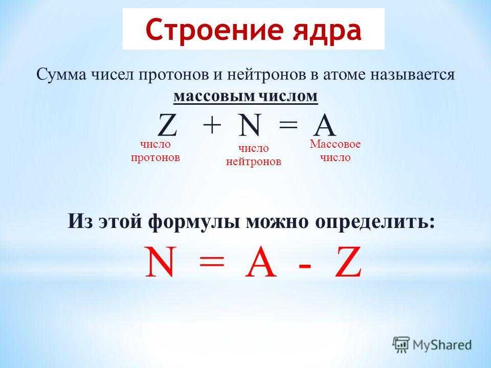 Сумма чисел протонов и нейтронов в атоме называется массовым числом Z + N = A число протонов число нейтронов Массовое число Из этой формулы можно определить: N = A — Z Строение ядра