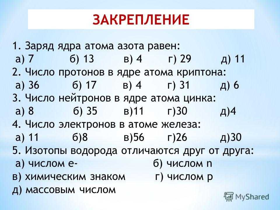 1. Заряд ядра атома азота равен: а) 7 б) 13 в) 4 г) 29 д) Число протонов в ядре атома криптона: а) 36 б) 17 в) 4 г) 31 д) 6 3. Число нейтронов в ядре атома цинка: а) 8 б) 35 в)11 г)30 д)4 4. Число электронов в атоме железа: а) 11 б)8 в)56 г)26 д)30 5. Изотопы водорода отличаются друг от друга: а) числом e- б) числом n в) химическим знаком г) числом p д) массовым числом ЗАКРЕПЛЕНИЕ