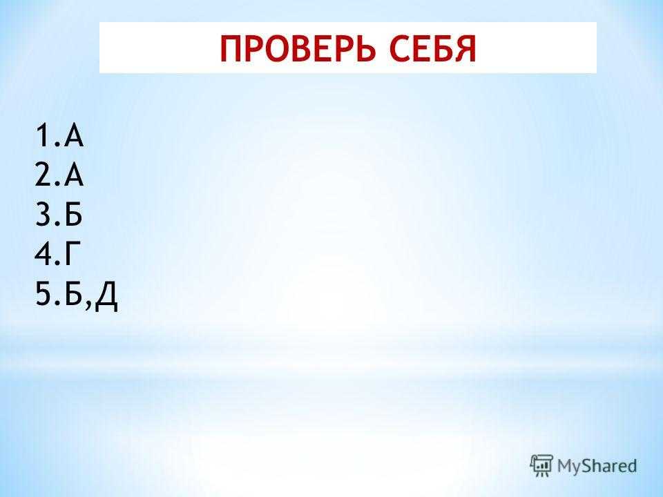 ПРОВЕРЬ СЕБЯ 1.А 2.А 3.Б 4.Г 5.Б,Д