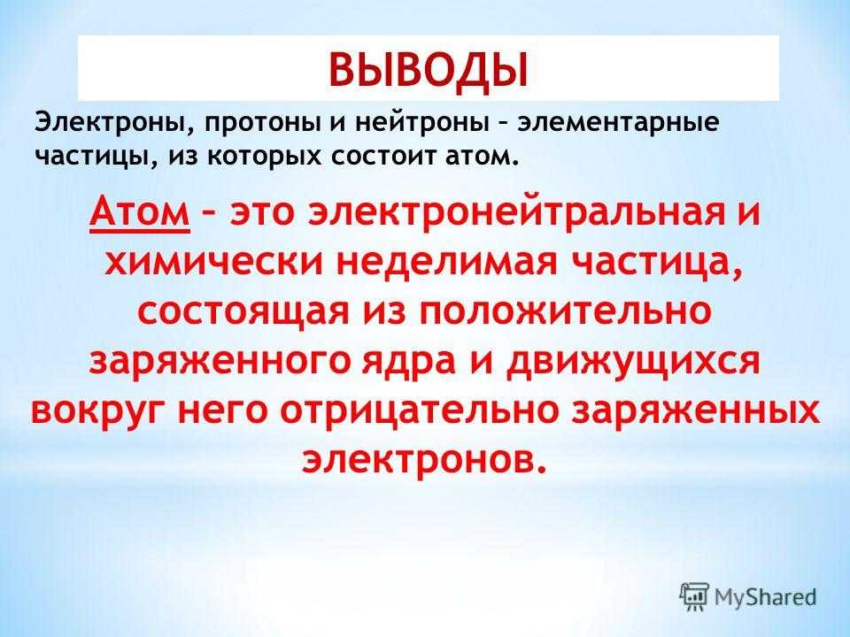 Электроны, протоны и нейтроны – элементарные частицы, из которых состоит атом. Атом – это электронейтральная и химически неделимая частица, состоящая из положительно заряженного ядра и движущихся вокруг него отрицательно заряженных электронов. ВЫВОДЫ