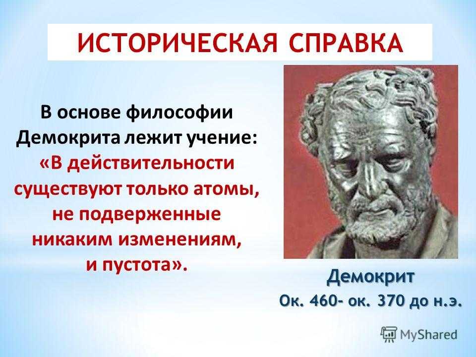 Демокрит Ок ок. 370 до н.э. В основе философии Демокрита лежит учение: «В действительности существуют только атомы, не подверженные никаким изменениям, и пустота». ИСТОРИЧЕСКАЯ СПРАВКА