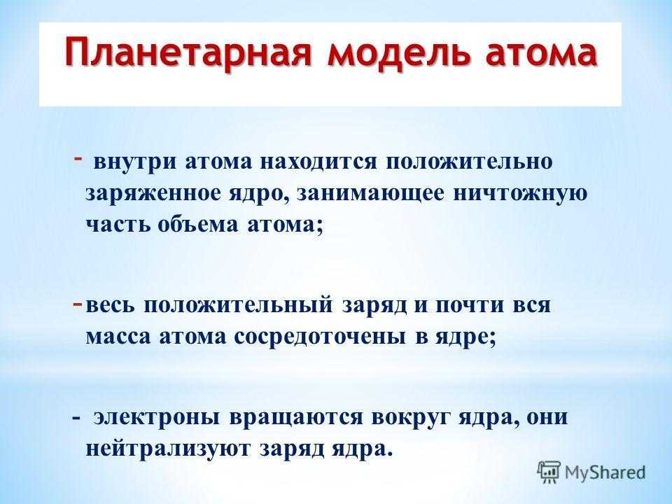 Планетарная модель атома — внутри атома находится положительно заряженное ядро, занимающее ничтожную часть объема атома; — весь положительный заряд и почти вся масса атома сосредоточены в ядре; — электроны вращаются вокруг ядра, они нейтрализуют заряд ядра.