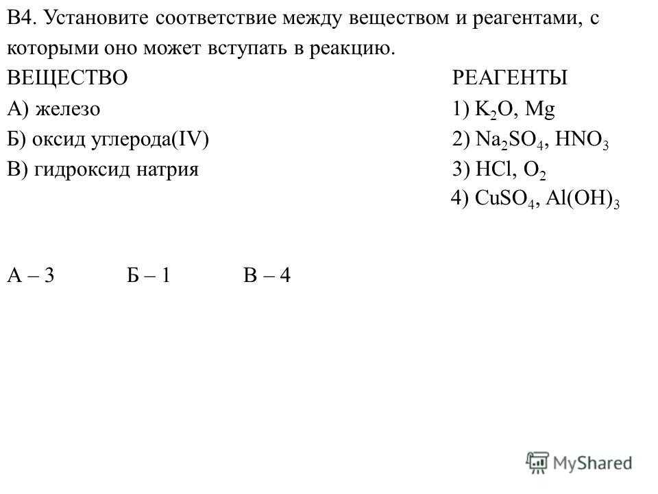 А – 3 Б – 1 В – 4 В4. Установите соответствие между веществом и реагентами, с которыми оно может вступать в реакцию. ВЕЩЕСТВО РЕАГЕНТЫ A) железо 1) K 2 O, Mg Б) оксид углерода(IV) 2) Na 2 SO 4, HNO 3 В) гидроксид натрия 3) HCl, O 2 4) CuSO 4, Al(OH) 3