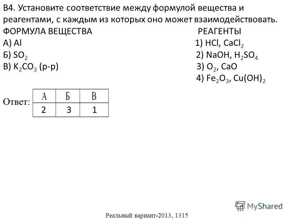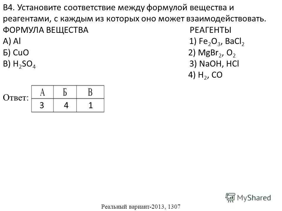 В4. Установите соответствие между формулой вещества и реагентами, с каждым из которых оно может взаимодействовать. ФОРМУЛА ВЕЩЕСТВА РЕАГЕНТЫ А) Al 1) Fe 2 O 3, BaCl 2 Б) CuO 2) MgBr 2, O 2 В) H 2 SO 4 3) NaOH, HCl 4) H 2, CO Ответ: Реальный вариант-2013,