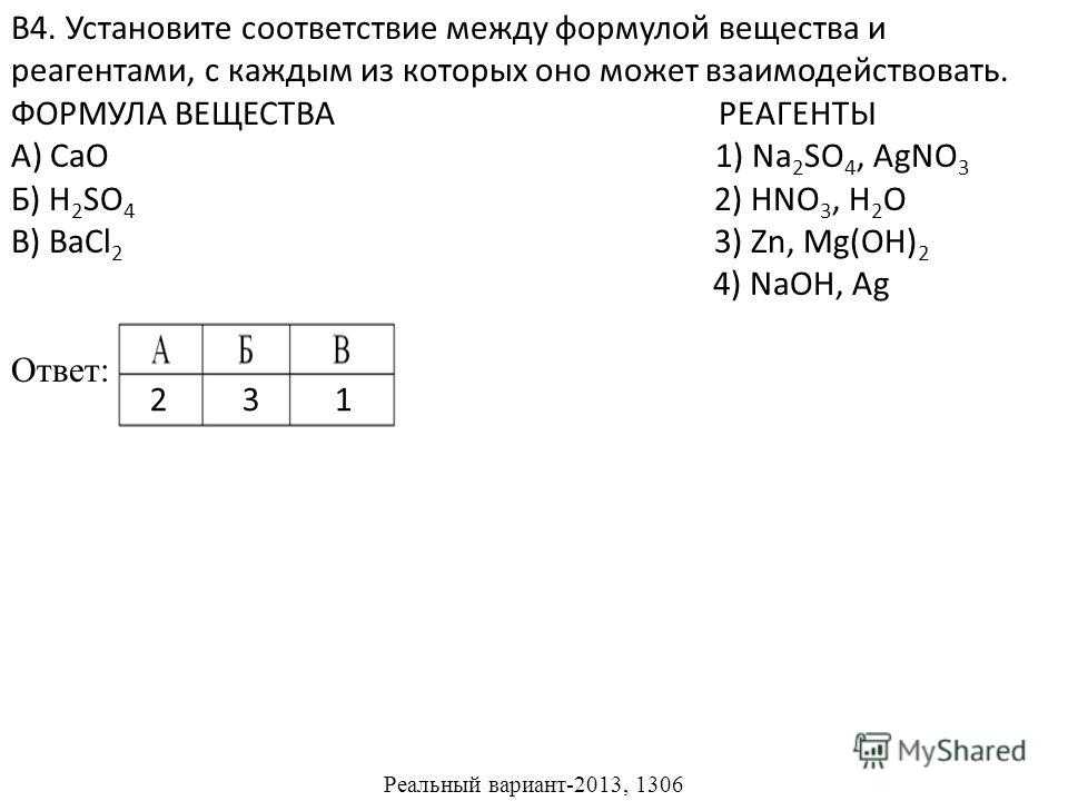 В4. Установите соответствие между формулой вещества и реагентами, с каждым из которых оно может взаимодействовать. ФОРМУЛА ВЕЩЕСТВА РЕАГЕНТЫ А) CaO 1) Na 2 SO 4, AgNO 3 Б) H 2 SO 4 2) HNO 3, H 2 O В) BaCl 2 3) Zn, Mg(OH) 2 4) NaOH, Ag Ответ: Реальный вариант-2013,