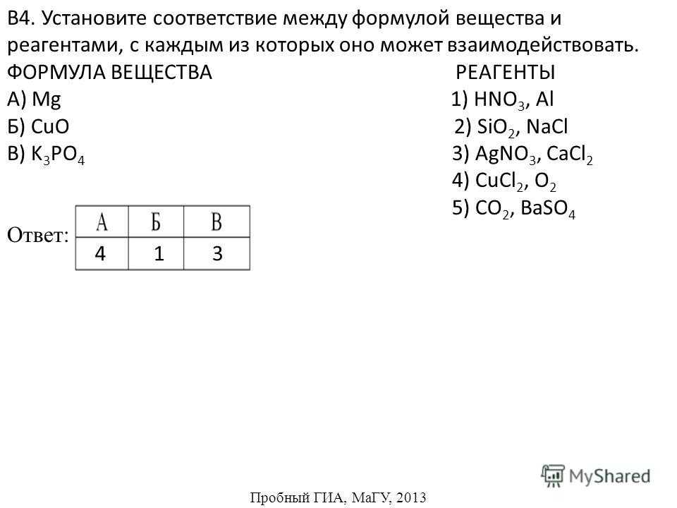 В4. Установите соответствие между формулой вещества и реагентами, с каждым из которых оно может взаимодействовать. ФОРМУЛА ВЕЩЕСТВА РЕАГЕНТЫ А) Mg 1) HNO 3, Al Б) CuO 2) SiO 2, NaCl В) K 3 PO 4 3) AgNO 3, CaCl 2 4) CuCl 2, O 2 5) CO 2, BaSO 4 Ответ: Пробный ГИА, МаГУ,