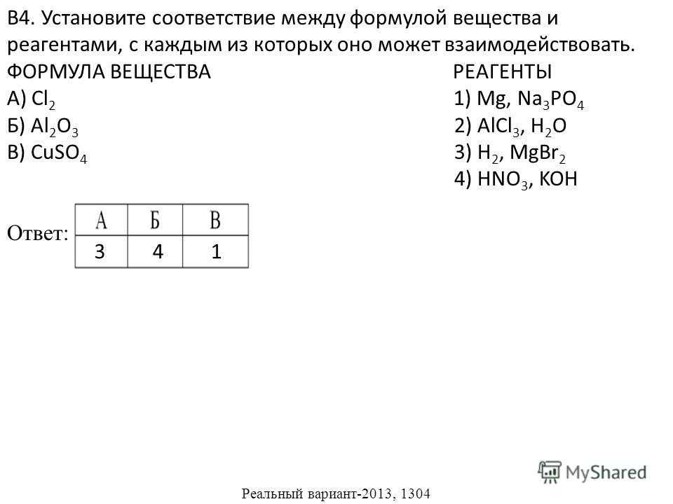 В4. Установите соответствие между формулой вещества и реагентами, с каждым из которых оно может взаимодействовать. ФОРМУЛА ВЕЩЕСТВА РЕАГЕНТЫ А) Cl 2 1) Mg, Na 3 PO 4 Б) Al 2 O 3 2) AlCl 3, H 2 O В) CuSO 4 3) H 2, MgBr 2 4) HNO 3, KOH Ответ: Реальный вариант-2013,