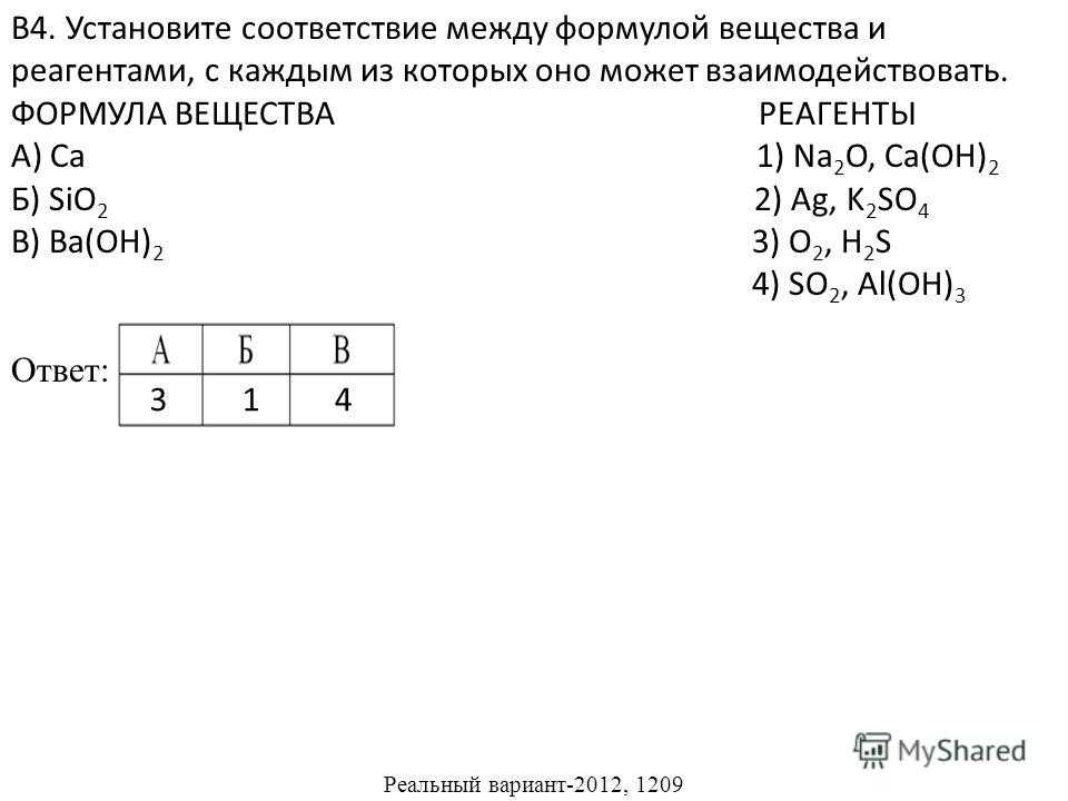 В4. Установите соответствие между формулой вещества и реагентами, с каждым из которых оно может взаимодействовать. ФОРМУЛА ВЕЩЕСТВА РЕАГЕНТЫ А) Ca 1) Na 2 O, Ca(OH) 2 Б) SiO 2 2) Ag, K 2 SO 4 В) Ba(OH) 2 3) O 2, H 2 S 4) SO 2, Al(OH) 3 Ответ: Реальный вариант-2012,