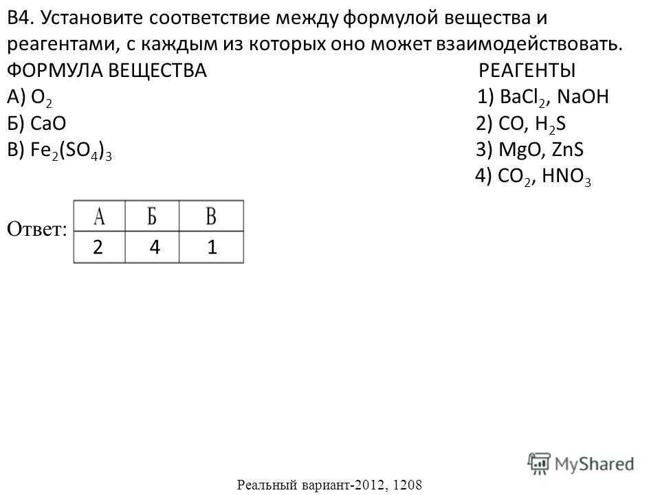 В4. Установите соответствие между формулой вещества и реагентами, с каждым из которых оно может взаимодействовать. ФОРМУЛА ВЕЩЕСТВА РЕАГЕНТЫ А) O 2 1) BaCl 2, NaOH Б) CaO 2) CO, H 2 S В) Fe 2 (SO 4 ) 3 3) MgO, ZnS 4) CO 2, HNO 3 Ответ: Реальный вариант-2012,
