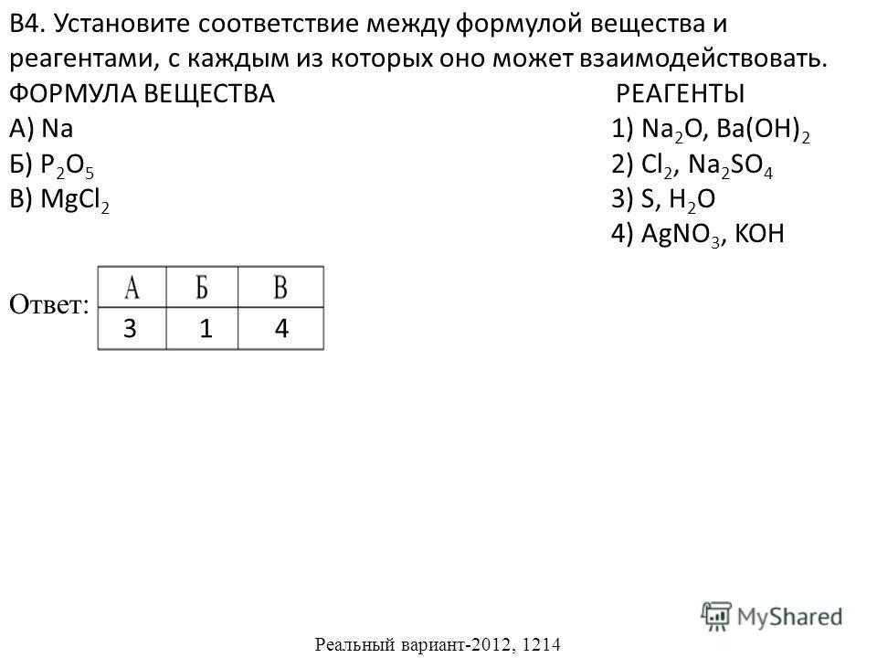 В4. Установите соответствие между формулой вещества и реагентами, с каждым из которых оно может взаимодействовать. ФОРМУЛА ВЕЩЕСТВА РЕАГЕНТЫ А) Na 1) Na 2 O, Ba(OH) 2 Б) P 2 O 5 2) Cl 2, Na 2 SO 4 В) MgCl 2 3) S, H 2 O 4) AgNO 3, KOH Ответ: Реальный вариант-2012,