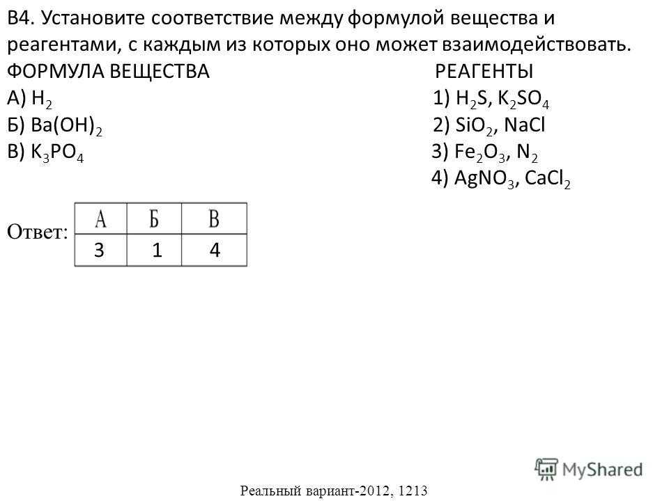 В4. Установите соответствие между формулой вещества и реагентами, с каждым из которых оно может взаимодействовать. ФОРМУЛА ВЕЩЕСТВА РЕАГЕНТЫ А) H 2 1) H 2 S, K 2 SO 4 Б) Ba(OH) 2 2) SiO 2, NaCl В) K 3 PO 4 3) Fe 2 O 3, N 2 4) AgNO 3, CaCl 2 Ответ: Реальный вариант-2012,