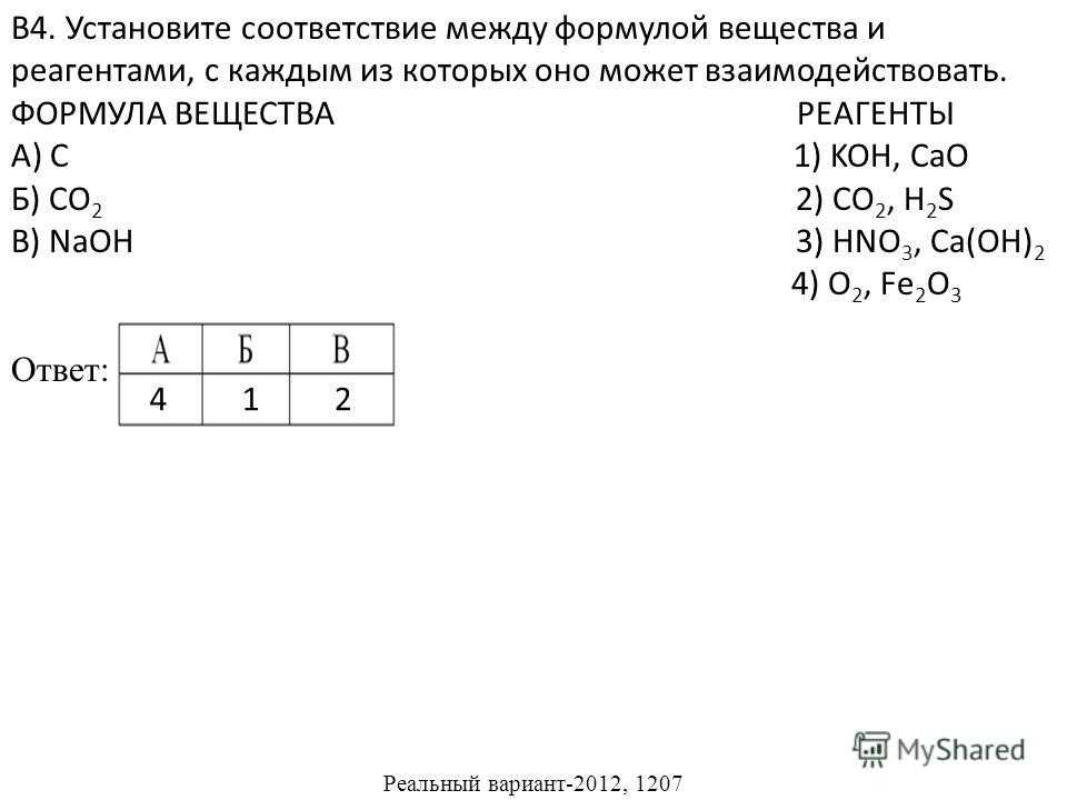 В4. Установите соответствие между формулой вещества и реагентами, с каждым из которых оно может взаимодействовать. ФОРМУЛА ВЕЩЕСТВА РЕАГЕНТЫ А) C 1) KOH, CaO Б) CO 2 2) CO 2, H 2 S В) NaOH 3) HNO 3, Ca(OH) 2 4) O 2, Fe 2 O 3 Ответ: Реальный вариант-2012,