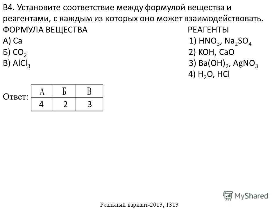 В4. Установите соответствие между формулой вещества и реагентами, с каждым из которых оно может взаимодействовать. ФОРМУЛА ВЕЩЕСТВА РЕАГЕНТЫ А) Ca 1) HNO 3, Na 2 SO 4 Б) CO 2 2) KOH, CaO В) AlCl 3 3) Ba(OH) 2, AgNO 3 4) H 2 O, HCl Ответ: Реальный вариант-2013,