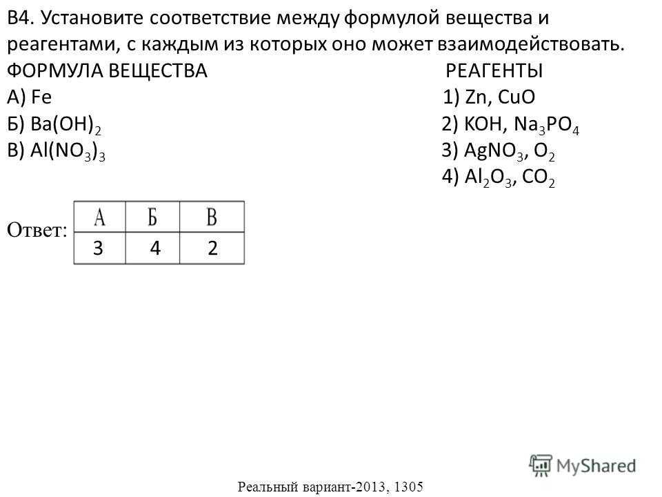 В4. Установите соответствие между формулой вещества и реагентами, с каждым из которых оно может взаимодействовать. ФОРМУЛА ВЕЩЕСТВА РЕАГЕНТЫ А) Fe 1) Zn, CuO Б) Ba(OH) 2 2) KOH, Na 3 PO 4 В) Al(NO 3 ) 3 3) AgNO 3, O 2 4) Al 2 O 3, CO 2 Ответ: Реальный вариант-2013,