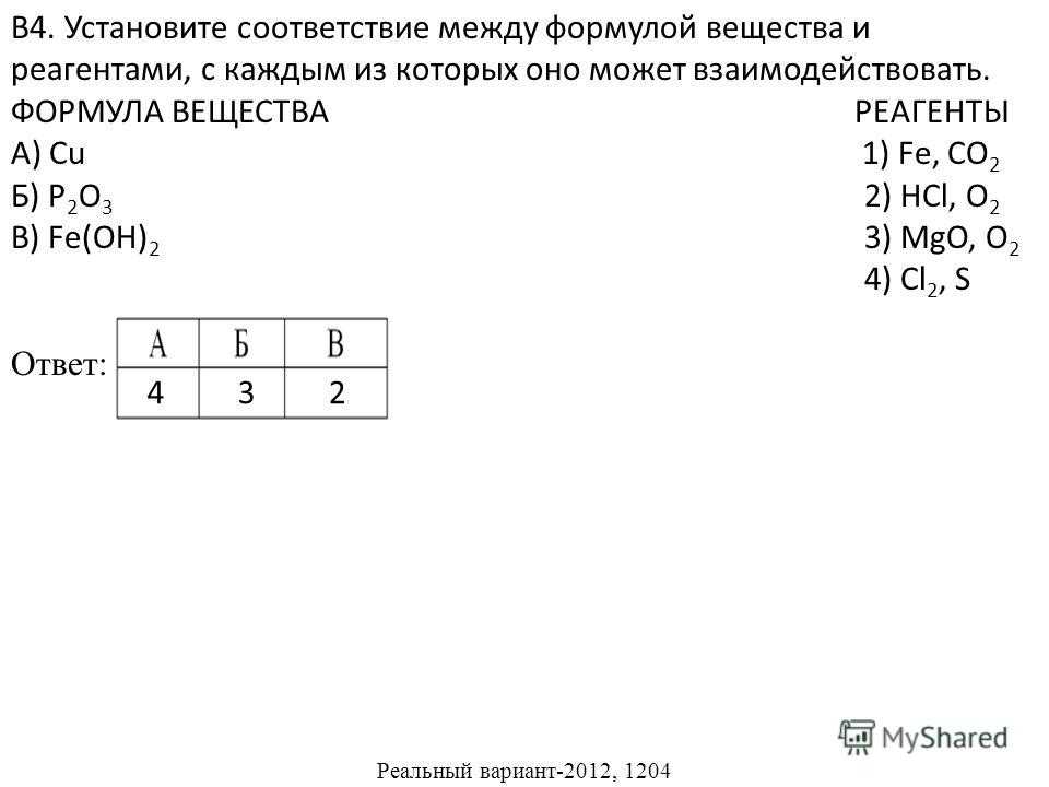 В4. Установите соответствие между формулой вещества и реагентами, с каждым из которых оно может взаимодействовать. ФОРМУЛА ВЕЩЕСТВА РЕАГЕНТЫ А) Cu 1) Fe, CO 2 Б) P 2 O 3 2) HCl, O 2 В) Fe(OH) 2 3) MgO, O 2 4) Cl 2, S Ответ: Реальный вариант-2012,