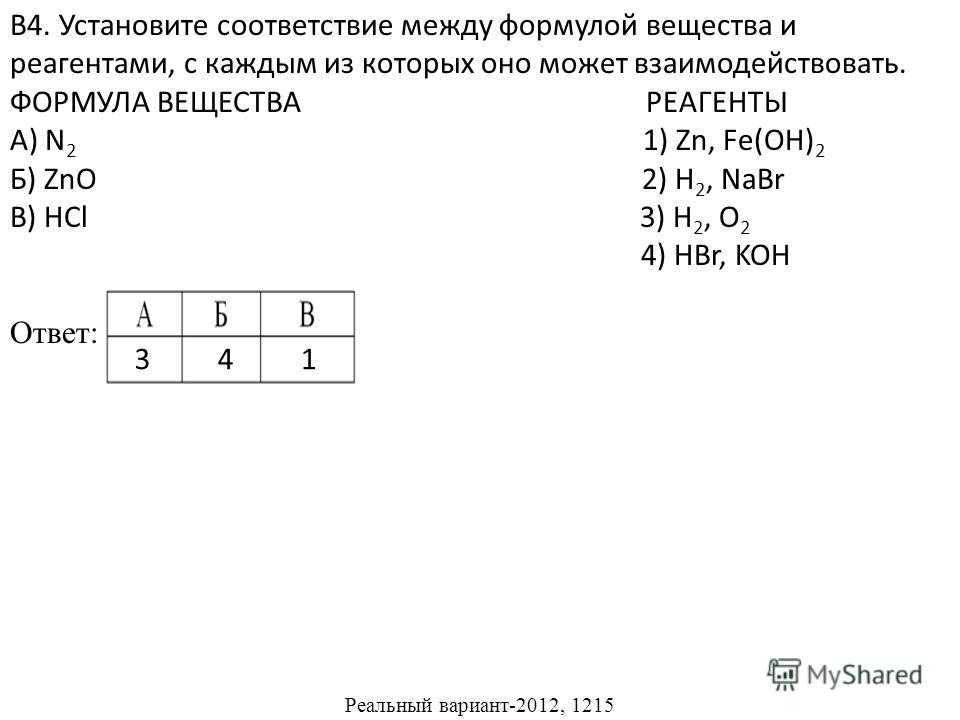 В4. Установите соответствие между формулой вещества и реагентами, с каждым из которых оно может взаимодействовать. ФОРМУЛА ВЕЩЕСТВА РЕАГЕНТЫ А) N 2 1) Zn, Fe(OH) 2 Б) ZnO 2) H 2, NaBr В) HCl 3) H 2, O 2 4) HBr, KOH Ответ: Реальный вариант-2012,
