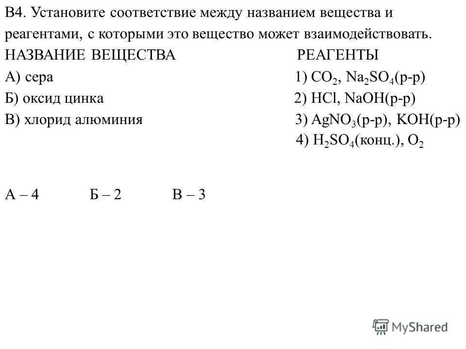 А – 4 Б – 2 В – 3 В4. Установите соответствие между названием вещества и реагентами, с которыми это вещество может взаимодействовать. НАЗВАНИЕ ВЕЩЕСТВА РЕАГЕНТЫ А) сера 1) CO 2, Na 2 SO 4 (р-р) Б) оксид цинка 2) HCl, NaOH(р-р) В) хлорид алюминия 3) AgNO 3 (р-р), KOH(р-р) 4) H 2 SO 4 (конц.), О 2