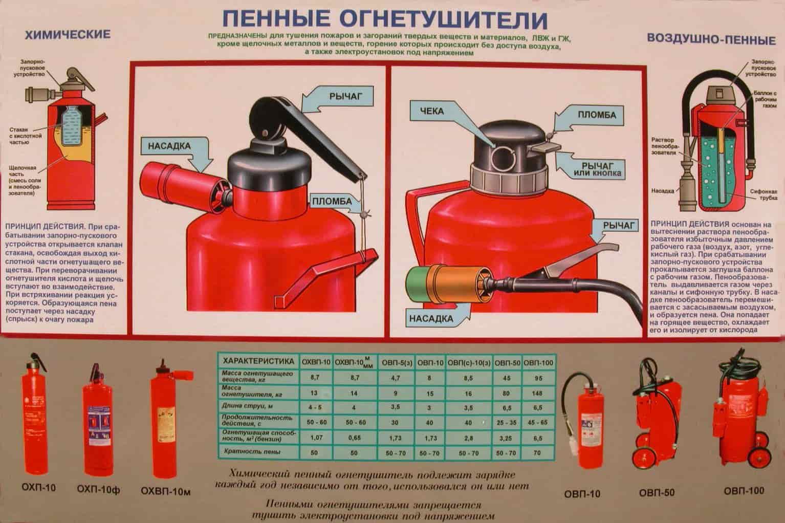 Воздушно-пенные огнетушители предназначены для тушения любых очагов возгорания, за исключением электроустановок, находящихся под напряжением.
