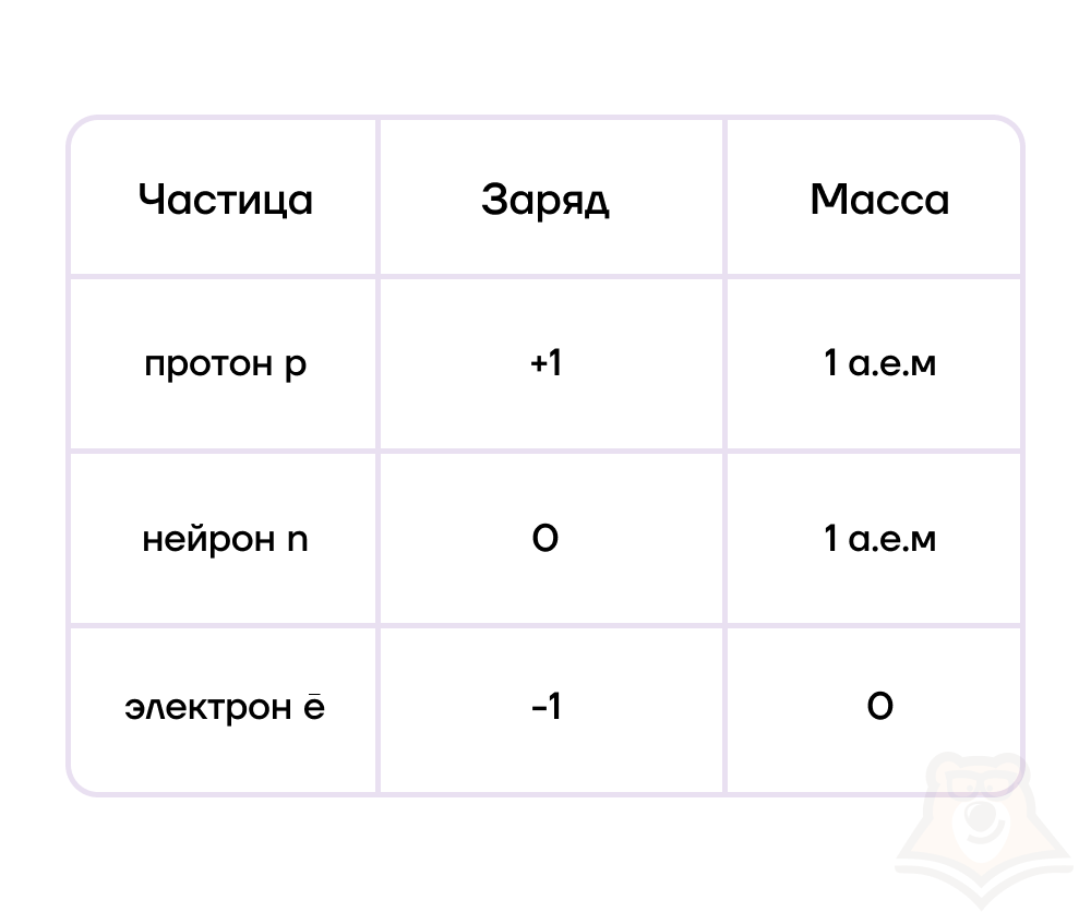 Разберем на примере углерода. Его порядковый номер — 6, значит, число протонов и электронов равно 6, заряд ядра +6.Атомная масса равна 12,01115, округлим до 12 и получим массовое число. Тогда количество нейтронов будет равно 12 — 6 = 6.