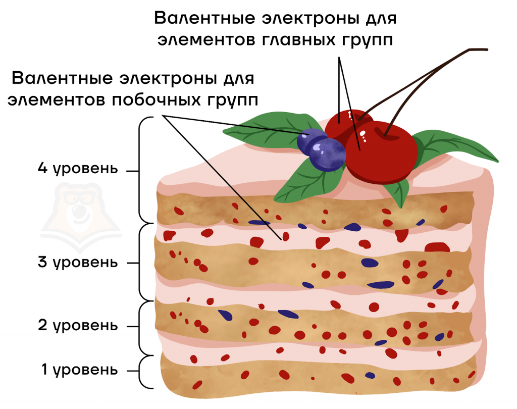 Представим вкусный большой многослойный ягодный торт. Каждый слой — своего рода уровень. На слоях располагаются ягоды, они же электроны. Но самые вкусные (валентные) всегда располагают сверху на торте. То есть валентные электроны могут быть как на внешнем (в качестве украшения торта), так и на предвнешнем (верхнем бисквитном слое) энергетическом уровне.