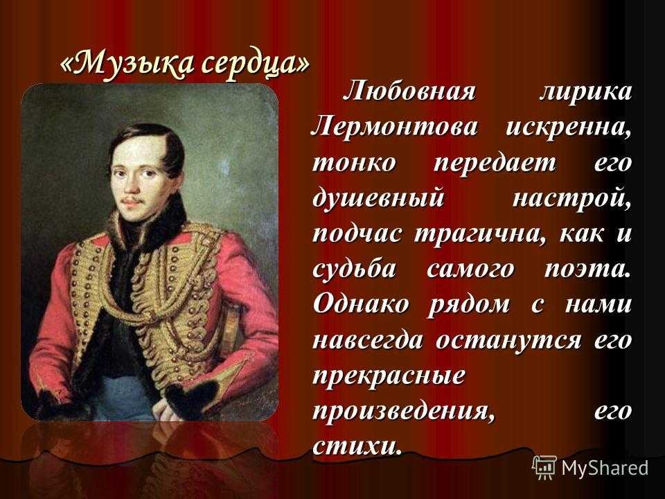 Зрелая лермонтовская лирика меняет фокус внимания: на смену внешнего конфликта с «ветхим миром» и демонстративного одиночества приходят рефлексия и интерес к психологическому портрету.