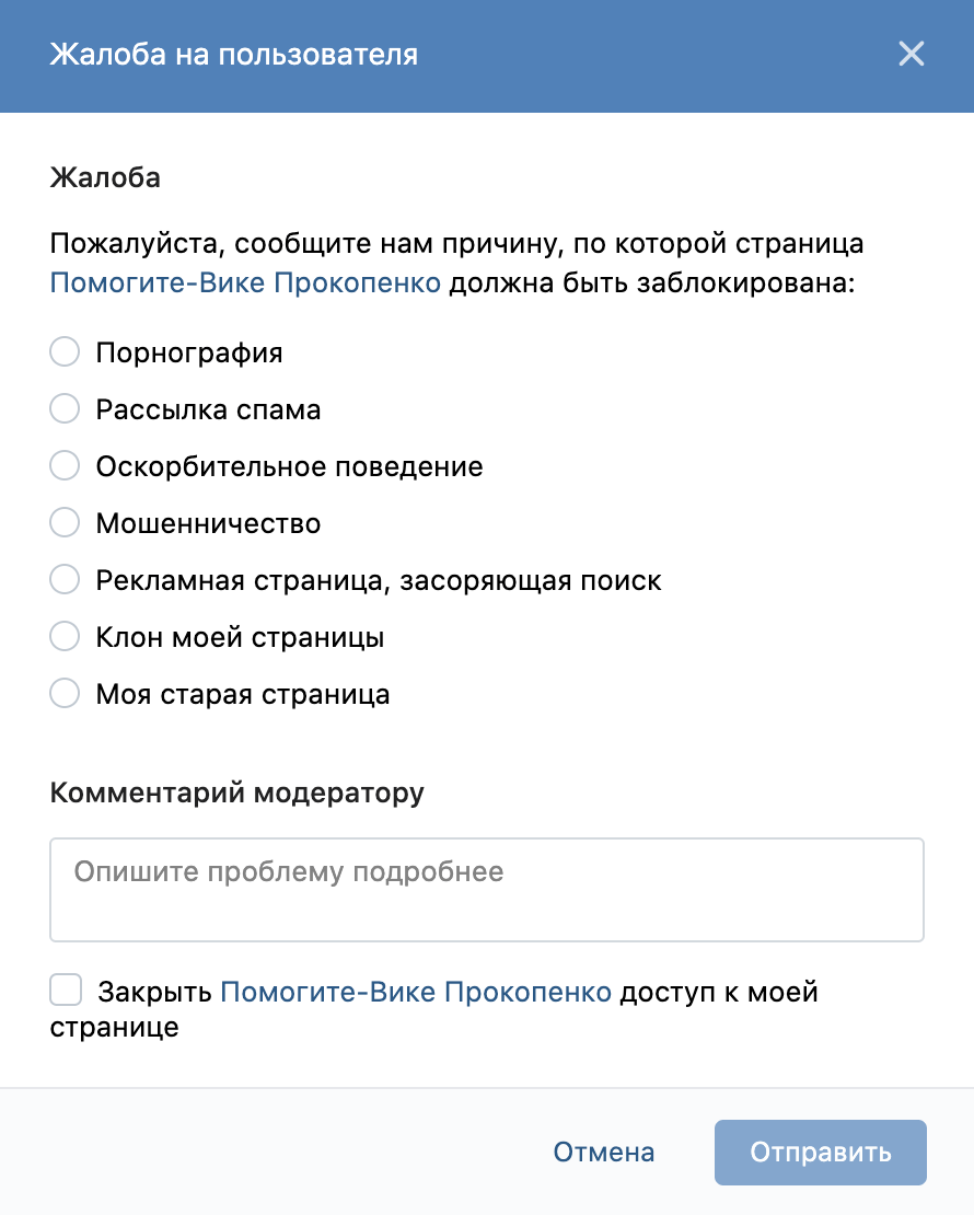 Чтобы пожаловаться на страницу, нажмите на три точки сбоку от фото или под ним. Затем выберите «Пожаловаться». После этого в «Инстаграме» нужно выбрать «Это спам», в «Одноклассниках» — «Распространение спама или рекламы», во «Вконтакте» — «Мошенничество», в «Фейсбуке» — «Мошенничество или фальшивые страницы».