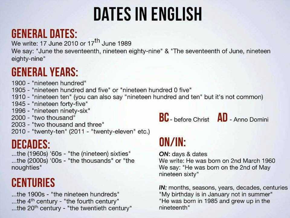 Обратите внимание на способы написания дат на английском языке. Их несколько и зависят они от того, какой вариант английского языка используется (британский или американский)