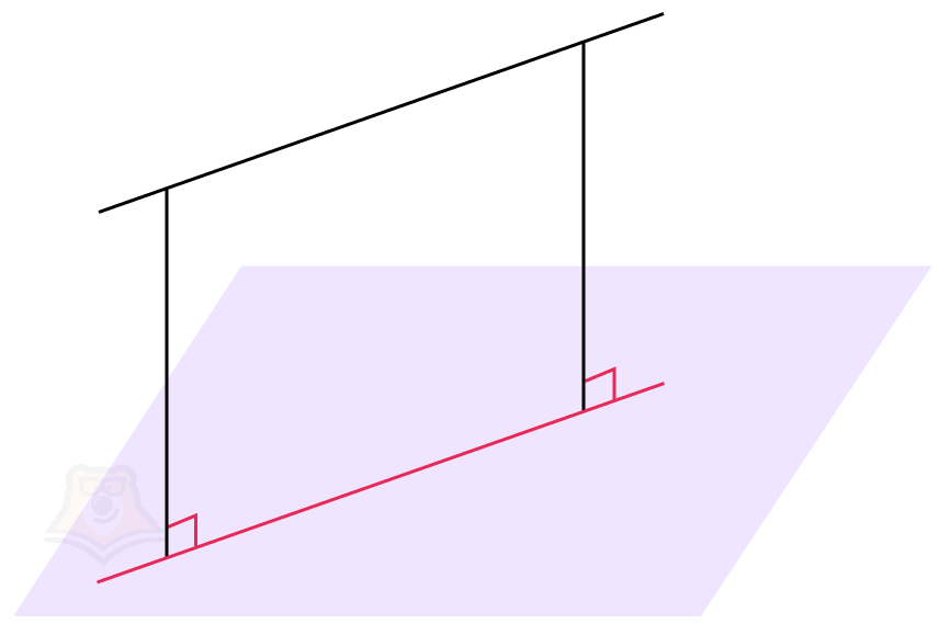 Следовательно, если необходимо в задаче доказать перпендикулярность прямой и плоскости, достаточно доказать, что прямая будет перпендикулярна всего двум пересекающимся прямым в этой плоскости, а не всему множеству прямых, лежащий в данной плоскости.