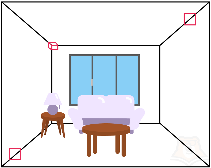 | Где в комнате можно найти перпендикулярные плоскости?Достаточно посмотреть на стены и пол, или стены и потолок. А еще на углы потолка — в них будет три перпендикулярные плоскости. |