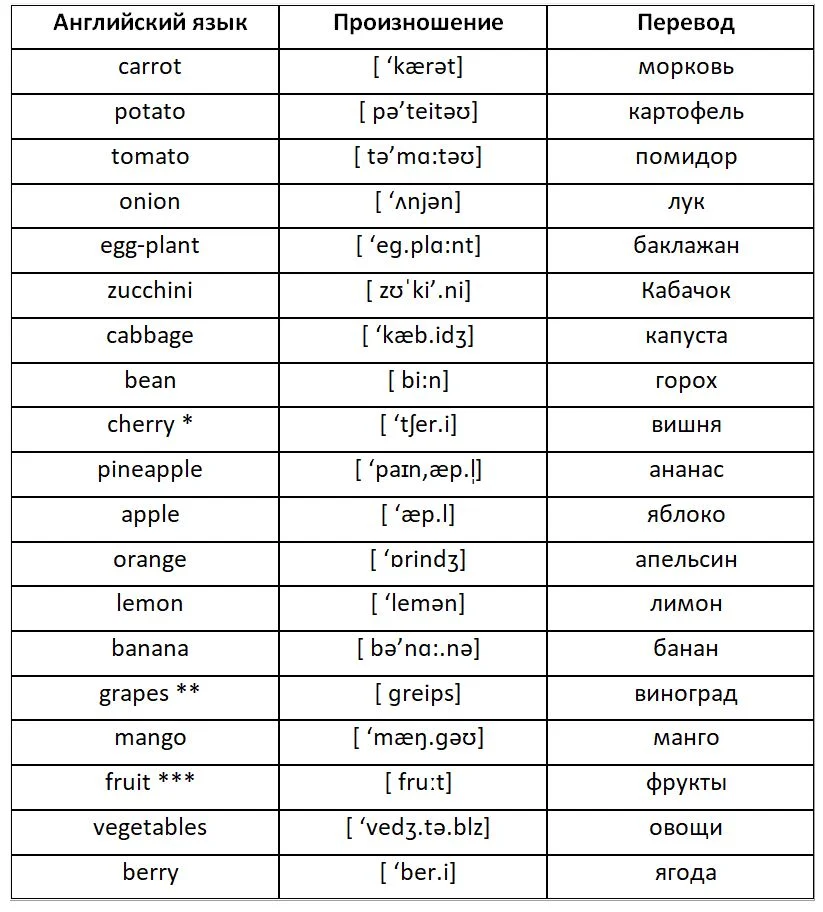 Кроме того, есть некоторые необычные слова-исключения. К ним относятся fruit и fish. Несмотря на то, что с ними можно образовать множественное число, это делается далеко не всегда. Когда речь идет о фруктах или рыбе без перечисления, форма числа останется единственной (при этом это не относится к слову vegetables – «овощи»). Например: