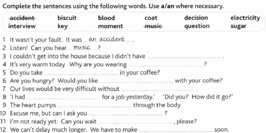 3. a key, 4. a coat, 5. sugar, 6. a biscuit, 7. electricity, 8. an interview, 9. blood, 10. a questions, 11. a moment, 12. a decision