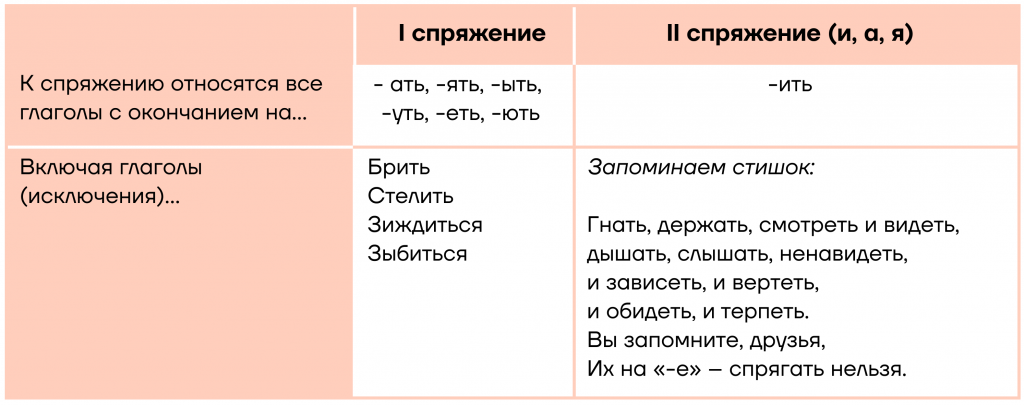 Еще эти гласные можно запомнить с помощью фразы: «Целую, милая!» Первым в предложении идет слово «целую», именно поэтому все гласные из этого слова (Е, У, Ю) мы отнесем к I-му спряжению. Вторым идет слово «милая», в котором буквы И, А, Я будут относиться ко II-му спряжению.