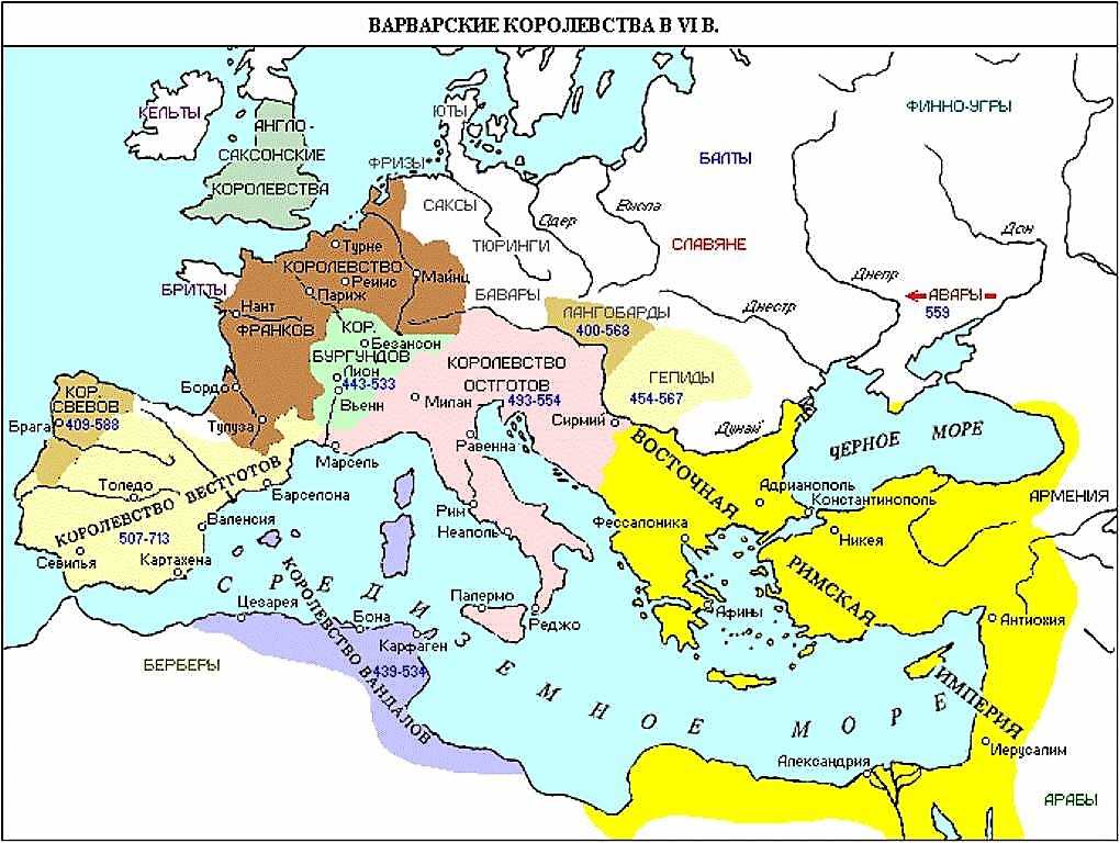 Первоначально германцы перемещались на территории от Рейна до Дуная в поисках пищи, убежища и богатства, оставляя после себя бедствия и разрушения домов, мостов и дорог. Не все германские племена были дикими варварами; некоторые из них переходили на оседлый образ жизни и старались жить цивилизованно. Вождь германского племени Одоакр, низложивший последнего императора Западной Римской империи Ромула Августула, сумел установить дипломатические отношения с Византийской империей. В дальнейшем варвары создали государства-королевства, некоторые из которых просуществовали несколько столетий.