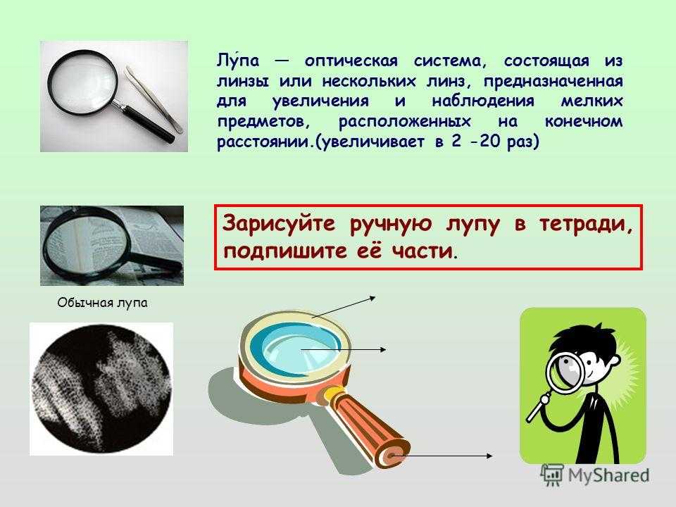 Обычная лупа Лупа оптическая система, состоящая из линзы или нескольких линз, предназначенная для увеличения и наблюдения мелких предметов, расположенных на конечном расстоянии.(увеличивает в раз) Зарисуйте ручную лупу в тетради, подпишите её части.