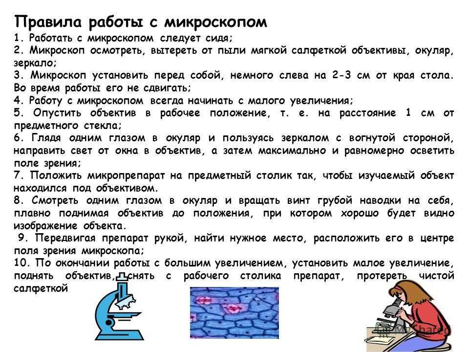 Правила работы с микроскопом 1. Работать с микроскопом следует сидя; 2. Микроскоп осмотреть, вытереть от пыли мягкой салфеткой объективы, окуляр, зеркало; 3. Микроскоп установить перед собой, немного слева на 2-3 см от края стола. Во время работы его не сдвигать; 4. Работу с микроскопом всегда начинать с малого увеличения; 5. Опустить объектив в рабочее положение, т. е. на расстояние 1 см от предметного стекла; 6. Глядя одним глазом в окуляр и пользуясь зеркалом с вогнутой стороной, направить свет от окна в объектив, а затем максимально и равномерно осветить поле зрения; 7. Положить микропрепарат на предметный столик так, чтобы изучаемый объект находился под объективом. 8. Смотреть одним глазом в окуляр и вращать винт грубой наводки на себя, плавно поднимая объектив до положения, при котором хорошо будет видно изображение объекта. 9. Передвигая препарат рукой, найти нужное место, расположить его в центре поля зрения микроскопа; 10. По окончании работы с большим увеличением, установить малое увеличение, поднять объектив, снять с рабочего столика препарат, протереть чистой салфеткой