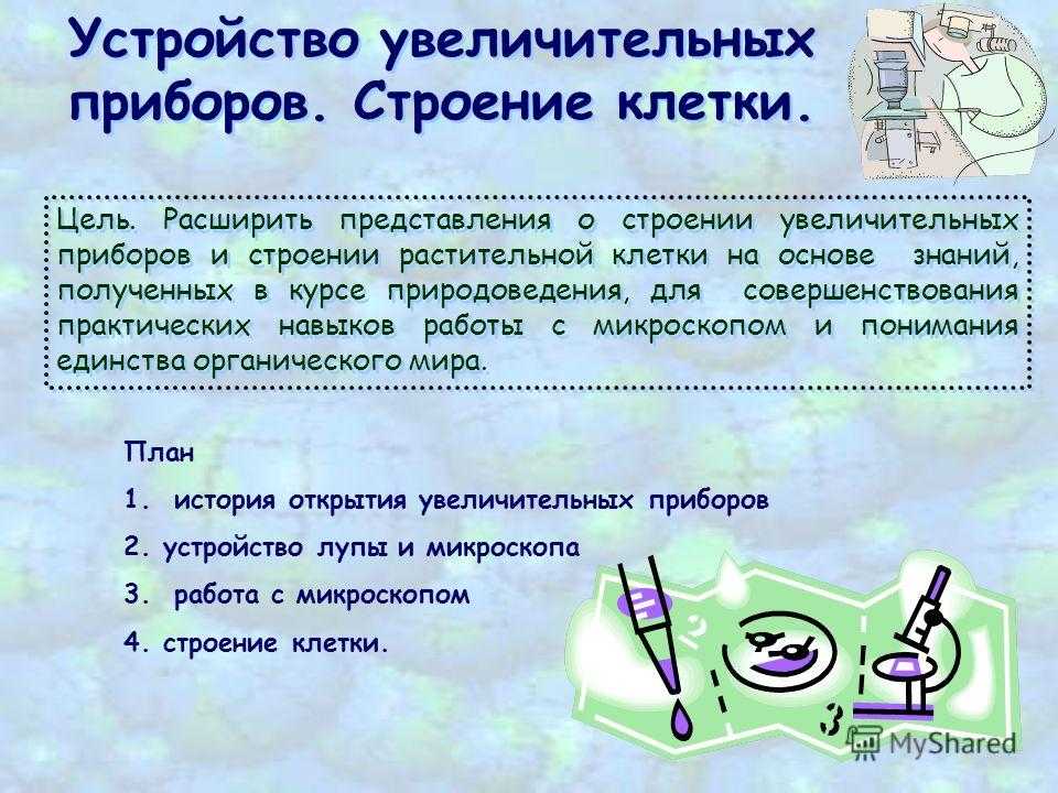 Устройство увеличительных приборов. Строение клетки. Цель. Расширить представления о строении увеличительных приборов и строении растительной клетки на основе знаний, полученных в курсе природоведения, для совершенствования практических навыков работы с микроскопом и понимания единства органического мира. План 1. история открытия увеличительных приборов 2.устройство лупы и микроскопа 3. работа с микроскопом 4.строение клетки.