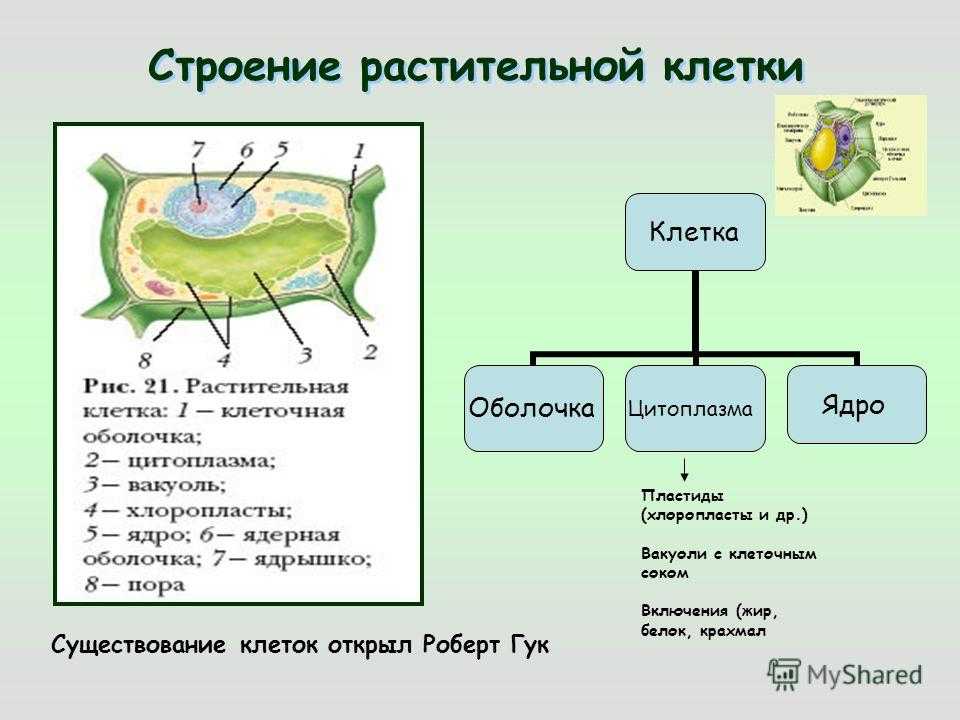 Строение растительной клетки Клетка ОболочкаЦитоплазмаЯдро Существование клеток открыл Роберт Гук Пластиды (хлоропласты и др.) Вакуоли с клеточным соком Включения (жир, белок, крахмал