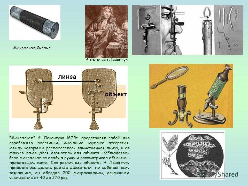 «Микроскоп» А. Левенгука 1675г. представлял собой две серебряные пластинки, имеющие круглые отверстия, между которыми располагалась единственная линза, в ее фокусе помещался держатель для объекта. Наблюдатель брал микроскоп за особую ручку и рассматривал объекты в проходящем свете. Для различных объектов А. Левенгуку приходилось делать разные держатели; по собственному заявлению, он обладал 200 микроскопами, дававшими увеличение от 40 до 270 раз. линза объект Антони ван Левенгук Микроскоп Янсона