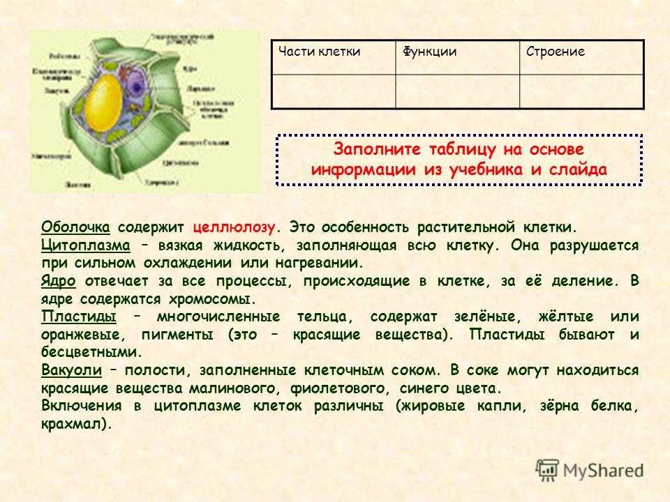 Части клеткиФункцииСтроение Заполните таблицу на основе информации из учебника и слайда Оболочка содержит целлюлозу. Это особенность растительной клетки. Цитоплазма – вязкая жидкость, заполняющая всю клетку. Она разрушается при сильном охлаждении или нагревании. Ядро отвечает за все процессы, происходящие в клетке, за её деление. В ядре содержатся хромосомы. Пластиды – многочисленные тельца, содержат зелёные, жёлтые или оранжевые, пигменты (это – красящие вещества). Пластиды бывают и бесцветными. Вакуоли – полости, заполненные клеточным соком. В соке могут находиться красящие вещества малинового, фиолетового, синего цвета. Включения в цитоплазме клеток различны (жировые капли, зёрна белка, крахмал).