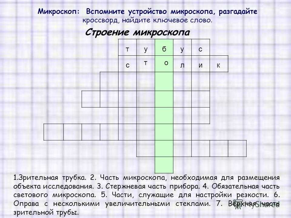 Микроскоп: Вспомните устройство микроскопа, разгадайте кроссворд, найдите ключевое слово. Строение микроскопа 1.Зрительная трубка. 2. Часть микроскопа, необходимая для размещения объекта исследования. 3. Стержневая часть прибора. 4. Обязательная часть светового микроскопа. 5. Части, служащие для настройки резкости. 6. Оправа с несколькими увеличительными стеклами. 7. Верхняя часть зрительной трубы. тбусу с то лик