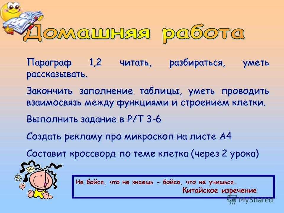 Параграф 1,2 читать, разбираться, уметь рассказывать. Закончить заполнение таблицы, уметь проводить взаимосвязь между функциями и строением клетки. Выполнить задание в Р/Т 3-6 Создать рекламу про микроскоп на листе А4 Составит кроссворд по теме клетка (через 2 урока) Параграф 1,2 читать, разбираться, уметь рассказывать. Закончить заполнение таблицы, уметь проводить взаимосвязь между функциями и строением клетки. Выполнить задание в Р/Т 3-6 Создать рекламу про микроскоп на листе А4 Составит кроссворд по теме клетка (через 2 урока) Не бойся, что не знаешь — бойся, что не учишься. Китайское изречение