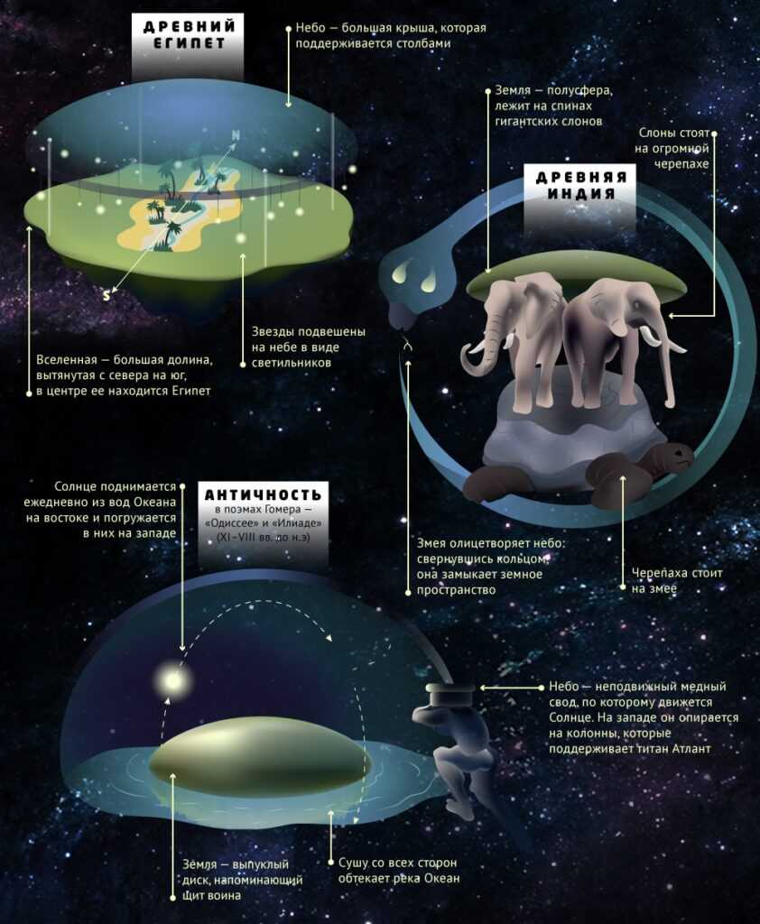 Многие древние народы были убеждены, что наша планета — плоская. Согласно некоторым верованиям, мир держится на спине крупного животного, наподобие кита или черепахи, плывущего посреди Мирового океана.