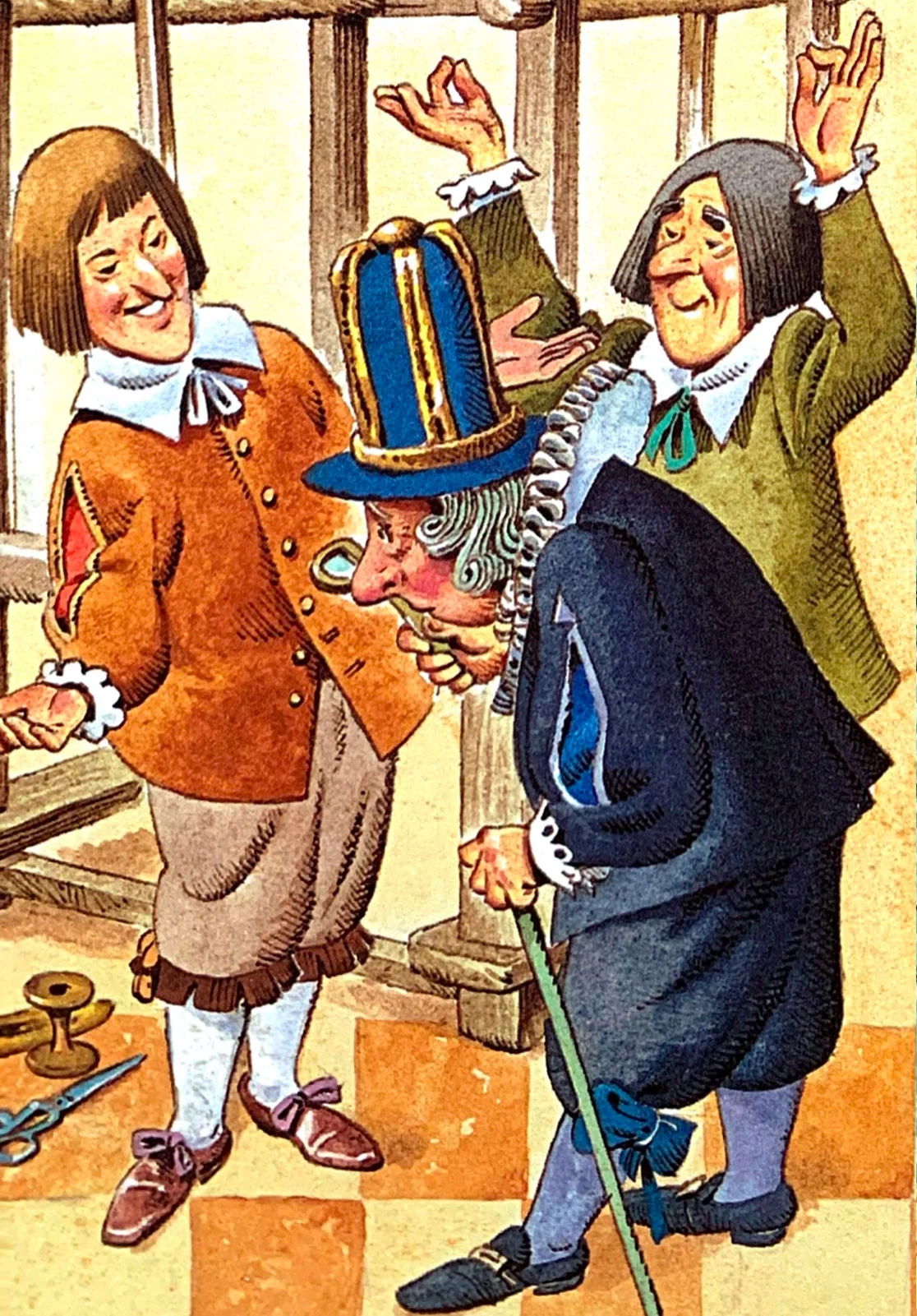 Скоро король послал другого честного чиновника, посмотреть как идут дела. Но и тот ничего не увидел и подумал про себя, что он глуп. Поэтому чиновник тоже сделал вид, что видит ткань и расхвалил ее королю. И вот уже сам король, вместе с придворными приходит в мастерскую и смотрит на пустой станок. Он боится в этом признаться и, как все, расхваливает ткань и узоры. И даже дает ткачам награды.