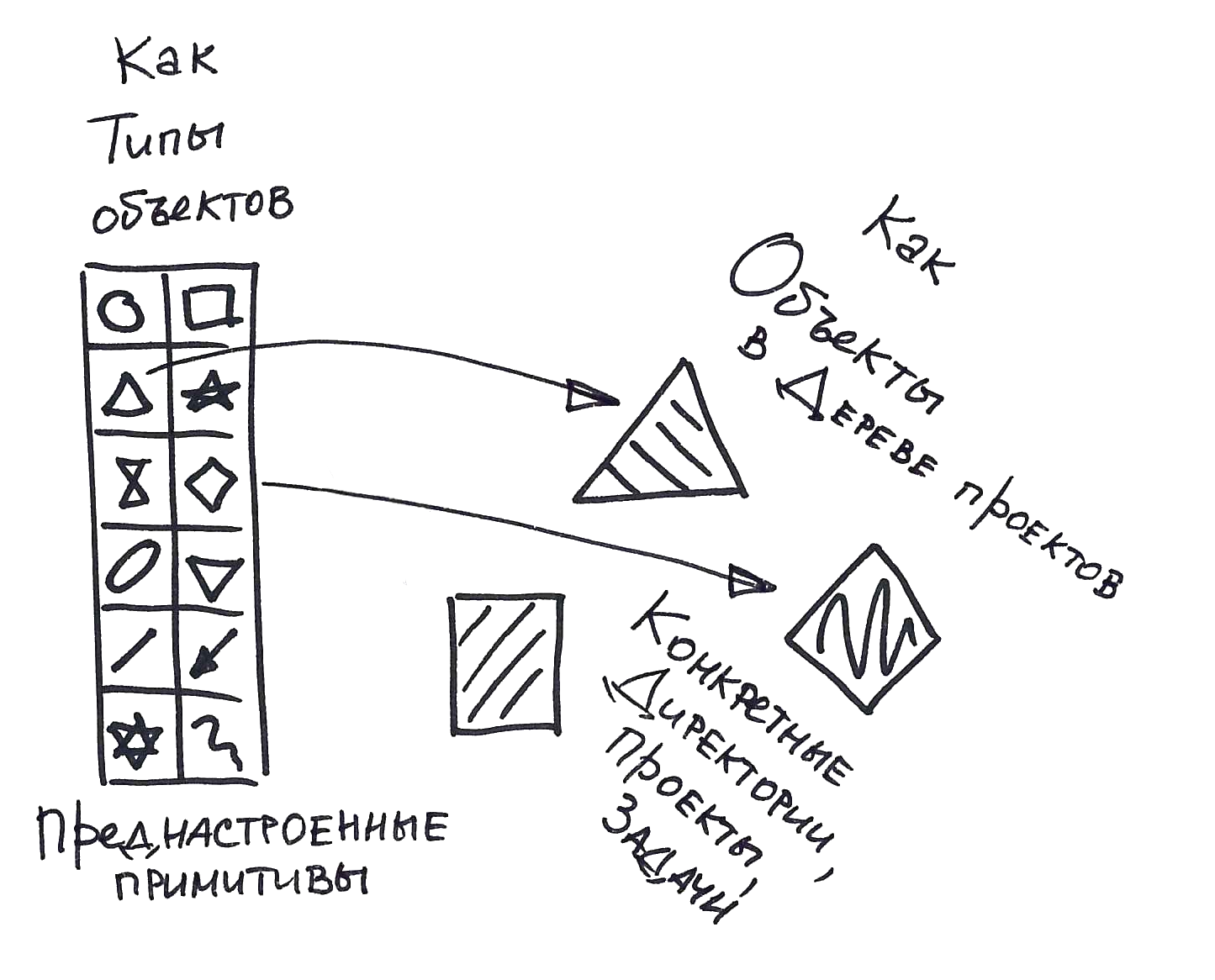 У вас есть набор примитивов и то, как вы ими рисуете. Инструменты рисования – это типы объектов, а то, что и где вы нарисовали – это объект в дереве проектов.